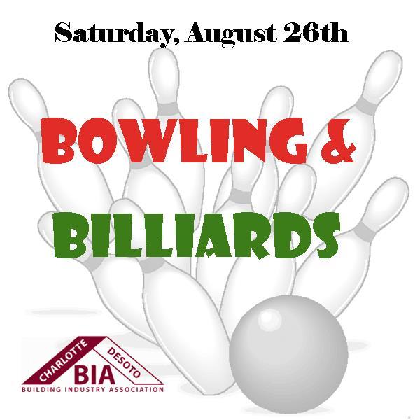 CDBIA to host 5th Annual Bowling and Billiards The Charlotte-DeSoto Building Industry Association invites you to join us in our 5th annual Bowling & Billiards event to be held on Saturday, August 26th at Treasure Lanes in Port Charlotte, Florida. Registration for each bowler includes bowling, shoes, food and soft beverages and starts at 5pm. Bowling will be from 6pm-9pm Pool Tournament will start at 8pm. Prizes for 1st and 2nd place. Registration price is $30 per person for bowling, with teams up to 6 people, and $20 for pool tournament. Door prizes are welcome. There are sponsorship opportunities to market your business. To register visit www.cdbia.com or call 941-625-0804. Bowling $30 per person. Pool Tournament $20 per person Register a whole lane (6 bowlers) and each bowler will receive a t-shirt in addition to bowling, shoes, food and non-alcoholic beverages. *Note- all shirts provided will be a size large. If you need a different size, please register before August 15th, and state your size when registering. Thank you Sponsorship information DEADLINE For Sponsorship Commitment is August 15th SPLIT Sponsor - $500 (1 of each available) GUTTERBALL SPONSOR - Thank you, Mr. Brown Septic! Lane Sponsors - $125 (26 available) Sign displayed at one Lane at the Bowling Alley, and one registration for bowling or pool tournament and event shirt. Tshirt Sponsor - Thank you, Super T! THE POOL HUSTLER Sponsor - $500 (1 available) TRICKSHOT SPONSOR - Thank you, Cantin Homes 8 BALL SPONSOR - $250 (1 available) Your company banner displayed at event (provided by company), Logo in Event Program & on ALL Event Promotions including event shirts 1 bowling registration or 1 pool tournament registration for each registrant. Special thanks to the Bowling & Billiards Committee Members: