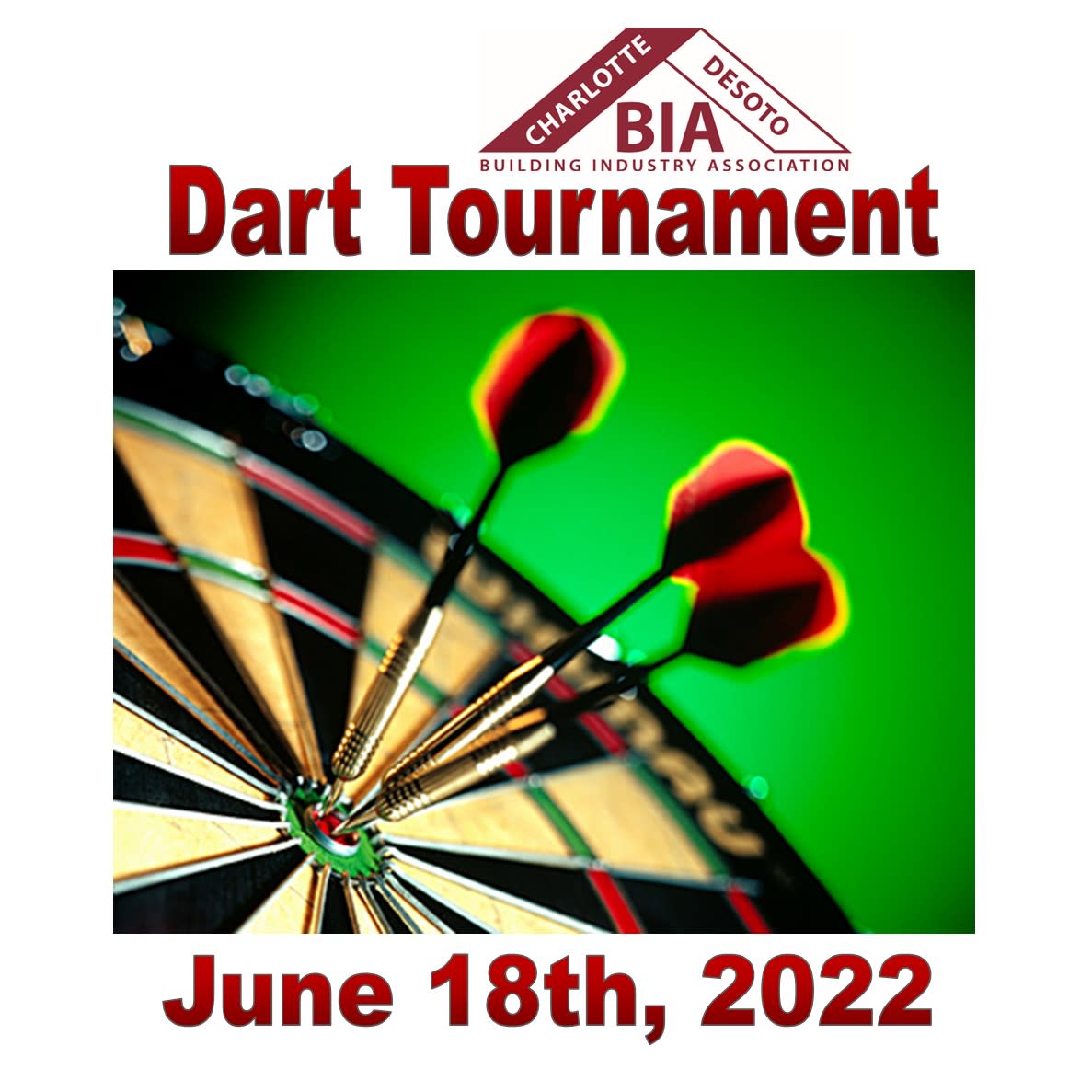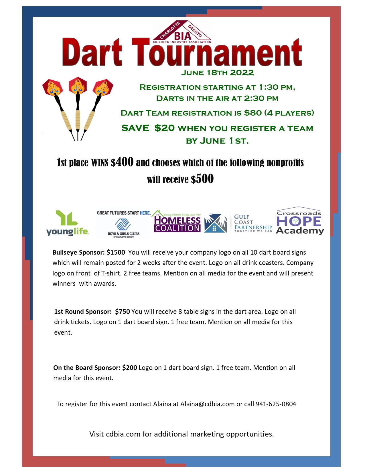You are invited to the Charlotte DeSoto Building Industry Association's Dart Tournament on June 18th 2022 at The Icehouse Pub (http://www.theicehousepub.com/) in Punta Gorda. Registration will begin at 1:30 pm and darts will be in the air at 2:30 pm. Prizes will be awarded for the 1st place dart team. Prize for 1st place: $400 AND they get to choose which of the following CDBIA nonprofit members will receive $500: Boy and Girls Club of Charlotte County C.A.R.E.S Registration is $80 per team (4 players). Sign up before June 1st and save $20. Teams just $60. Sponsorship opportunities available: Bullseye Sponsor - $1000 Your Company's Logo on all 10 Dart Board Signs which will remain posted for 2 weeks after the event . Mentioned in all event promotions. Logo on drink coasters. Company logo on front of T-shirts. Sponsor is able to put marketing material at dart tournament event. Two free team registrations (8 players) and the opportunity to present the winners with awards. 1st Round Sponsor - $750 8 table signs in the Dart Bar Area. Logo on Drink Tickets. Mentioned in all Event Promotions. Logo on 1 Dart Board sign. One free team registration (4 players). On the Board Sponsor - $200 Logo on Dart Board Sign which remain posted for two (2) weeks after the event. One free team registration (4 players). Mention in all event promotions Thank you!!!