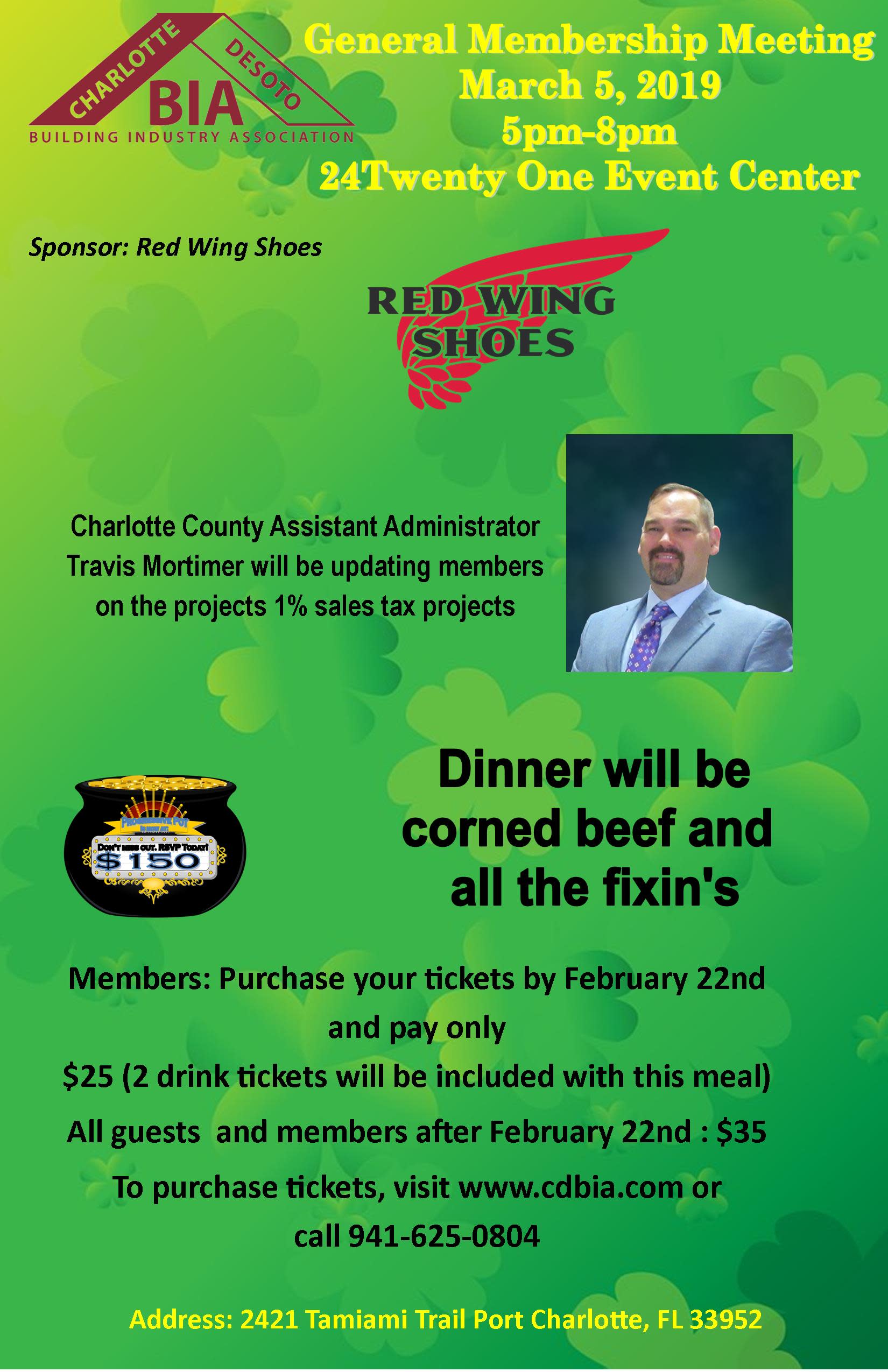 Join us for a fun gathering of the CDBIA family for our March General Membership Meeting, which will be held at 24Twenty One Event Center An Irish dinner of corned beef and all the fixin's will be prepared by: Luigi's Pizzeria & Restaurant Sponsored by: Date: March 5, 2019CDBIA General Membership Meeting sponsored by Red Wing Shoes