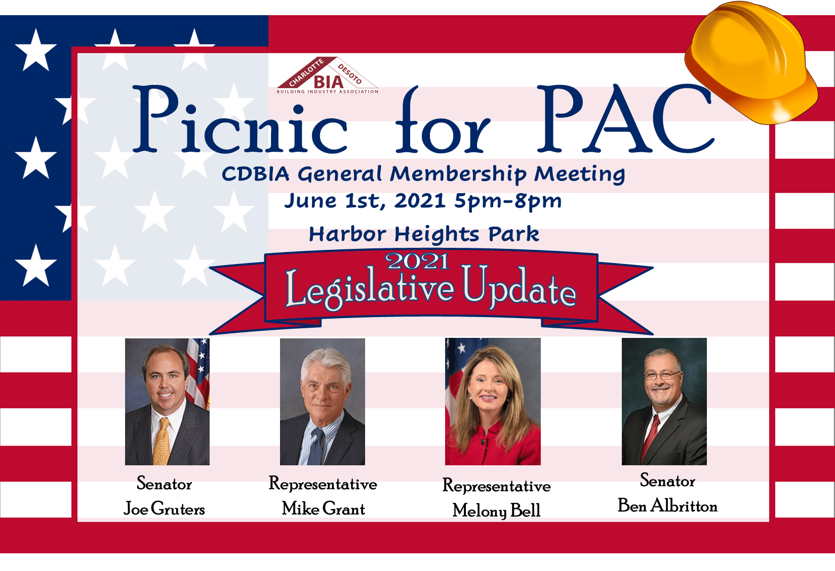 Join us for the CDBIA June General Membership Meeting- Legislative Update This will be a picnic for PAC. All proceeds from this event will go to the Charlotte-DeSoto Building Industry Political Action Committee and Florida Home Builders Political Action Committee. June 1st, 2021 5pm-8pm The meeting will take place at: Harbor Heights Park 27420 Voyageur Drive Punta Gorda, FL 33983 As the 2021 Legislative Session wraps up, this meeting will give you up to date changes for the building industry. Joining us for this evening is: Rusty Payton, CEO Florida Home Builders Association Dane Bennett, Director of GA, FHBA Senator Joe Gruters, District 23 Senator Ben Albritton, District 56 Representative Mike Grant, District 75 Representative Melony Bell, District 56. The grill is back! This time we have the NEXT GENERATION cooking up a feast for you! We are excited to have Matt Mappes (Gant Electric), John Carlson (Wharton-Smith), TJ Thornberry (Thornberry Custom Builders) and Logan Degross (Quality Homes of Port Charlotte) Our Spike Bar is back! Dinner includes 2 drink tickets Price is $30 for members, $40 per guest. Space is limited. 100% of the proceeds from this event will be contributed to the local and state PACs Progressive Pot At the end of the evening, one CDBIA member's name will be drawn to win the progressive pot. This month, the pot is at $400.00! If the member is present, they will win the pot. If not, we will add $50 to the pot and draw again next month. Cancellations will be accepted until May 31st.