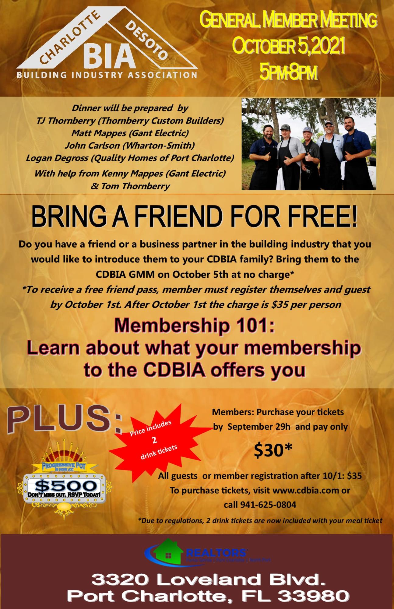Brats, Building and Beer! Date: October 5, 2021 Time: 5pm-8pm Location: PGPCNP DeSoto Association of Realtors 3320 Loveland Blvd. Port Charlotte, FL 33980 Get ready for a night of networking as we celebrate Oktoberfest, the building industry way! Our next generation of grillers will be back to prepare a feast for you! On the grill we will have: With help from Kenny Mappes (Gant Electric) Bring a friend for free! Do you have a friend or a business partner in the building industry that you would like to introduce them to your CDBIA family? Bring them to the CDBIA GMM on October 5th at no charge* Cost is $30, includes 2 tickets and 2 drink tickets each. *To receive a free friend pass, member must register themselves and guest by October 1st . After October 1st the charge is $35 per person. BONUS! If your guest becomes a member of the CDBIA at the October GMM, both member and a new member will be entered into a raffle for a free pass to all GMMs for 2021! Please register by October 1st to be entered into the drawing. Membership 101 Do you know all the deals, savings and assistance your membership offers you? At this meeting, we will be reviewing many of the ways your CDBIA membership can assist you with your business. Learn more about savings, contracts available to you and ways the CDBIA helps with advocacy. Register today at https://charlottedesotobia.growthzoneapp.com/ap/Events/Register/aPoE8n1r?mode=Attendee
