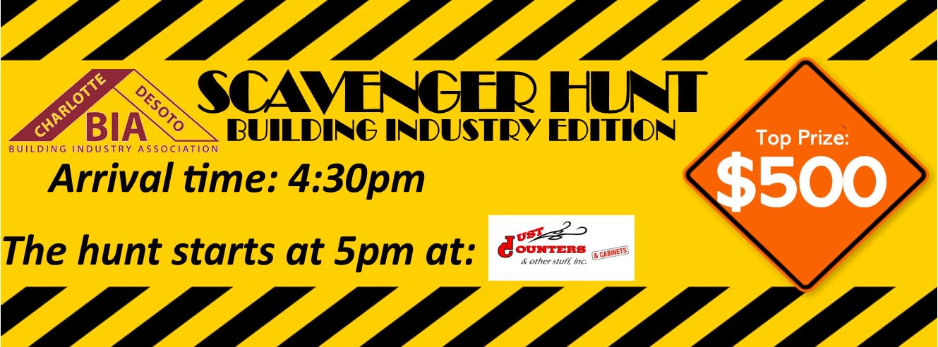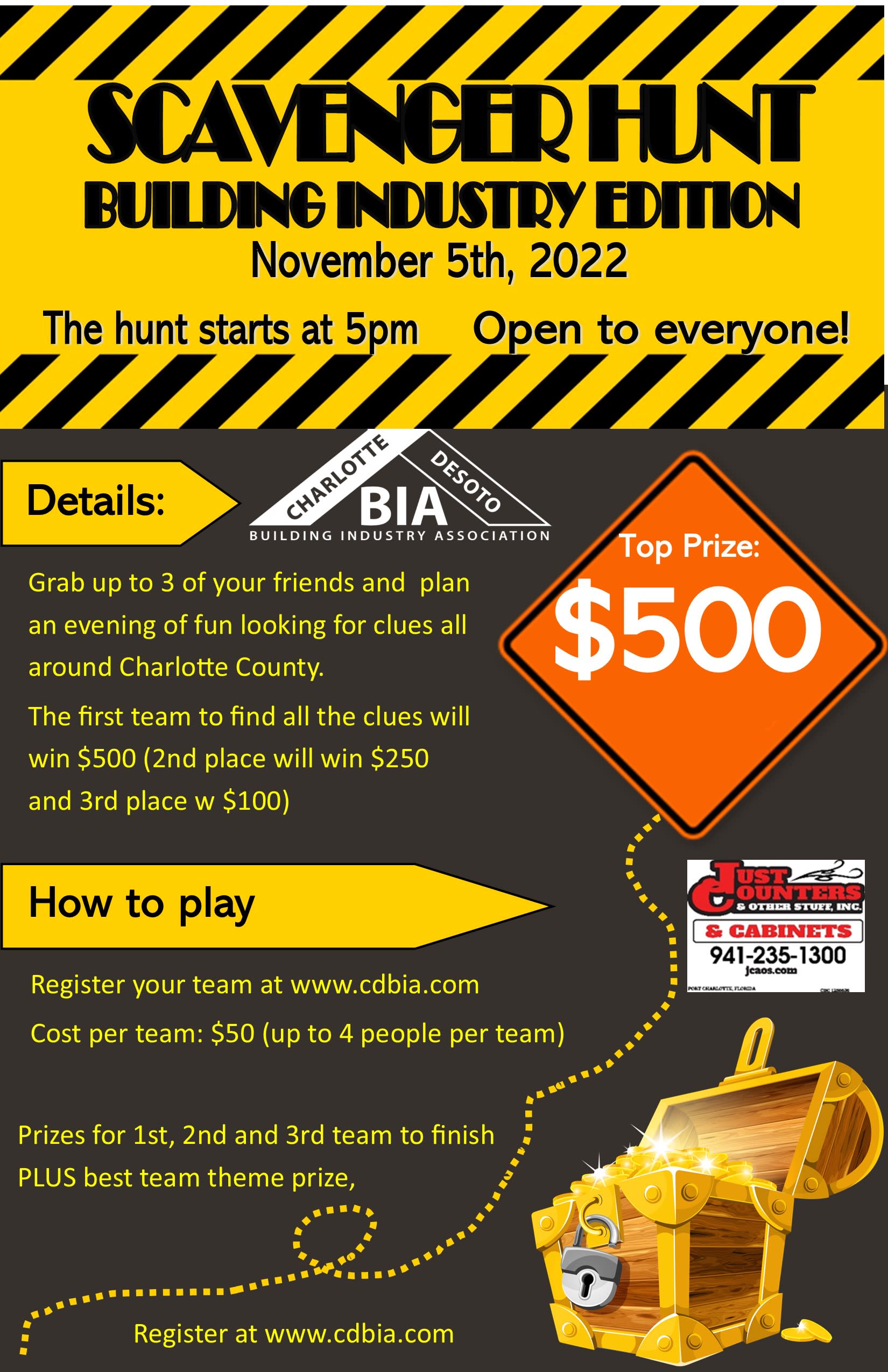 Grab up to four of your friends, find the clues and win the cash! The CDBIA presents the CDBIA Scavenger Hunt Meeting and end point will be at Just Counters & Other Stuff Address: 1489 Market Circle, Port Charlotte, FL 33953 Refreshments will be served before and after the scavenger hunt. Each team will be given a list of clues to find the signs around town. The first team to come back to the meeting point will win $500. This event is open to everyone. Each team (up to 4 people) is $50* Prizes for the evening: 1st Place: $500 2nd Place: $250 3rd Place: $100 There will also be a team theme prize, so get creative with your attire for the evening! *A team consists of up to 4 people in one car Sponsorship is available! All sponsors will be able to put a flyer of their choice in the gift bag for each player. You will be promoted on social media, and at the event. We would be honored if you choose one of the sponsorship that best suits your business Starting Point Sponsor: Just Counters & Other Stuff Relief Sponsor: $250 Recovery Sponsor: $250 Rebuild Sponsorship $400 (BEST DEAL) To Register click the link below or call Alaina at 941-625-0804 or contact by email at Alaina@CDBIA.com Thank you to our Sponsors!