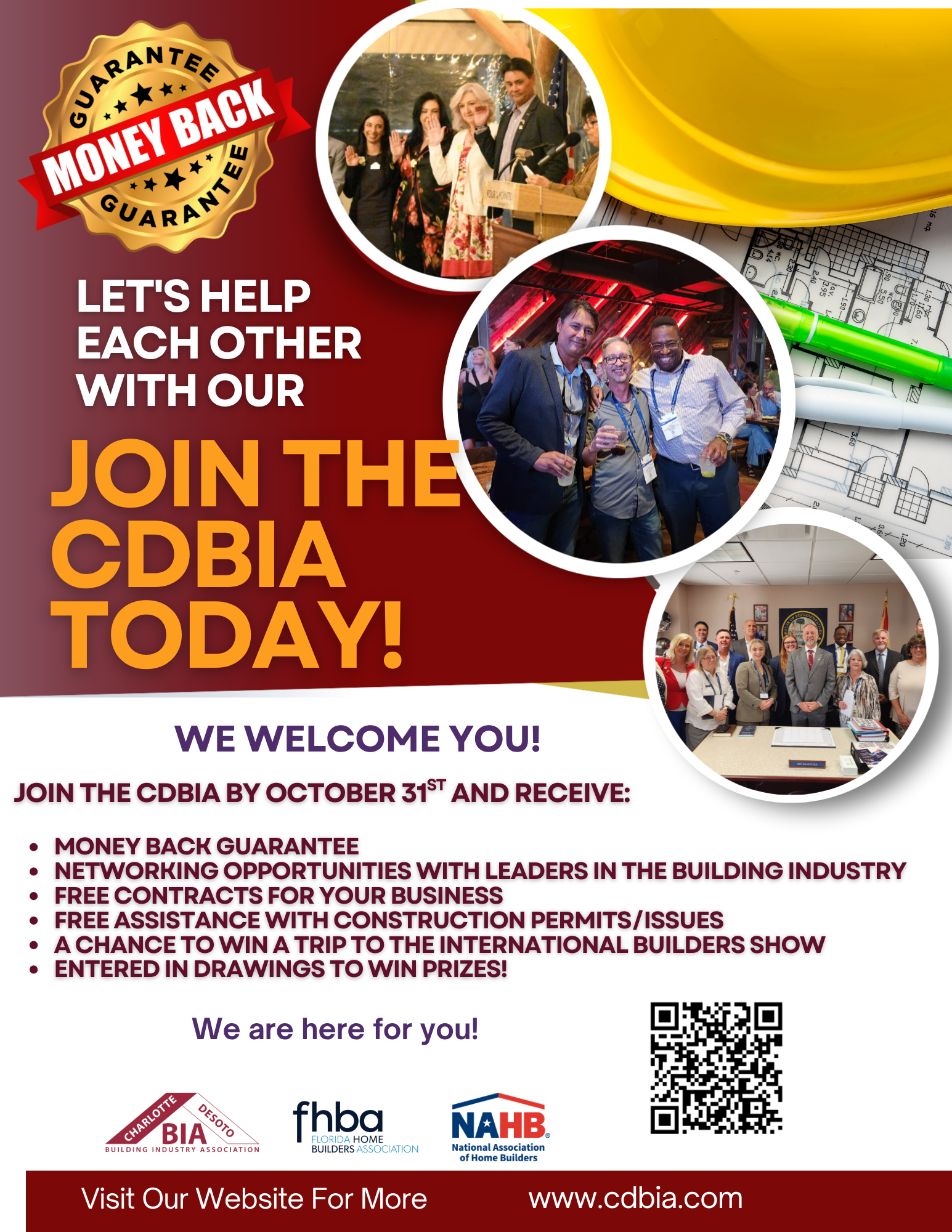 Thank you for helping build our community. Charlotte DeSoto Building Industry Association leadership works on your behalf, to keep building strong in our community. The CDBIA is affiliated with the Florida Home Builders Association and the National Association of Home Builders. Especially since the onset of COVID, we have been trying to help provide value to all companies in the building industry. We would like to invite you to the CDBIA office on October 22nd from 12pm-2pm for lunch. You are welcome to stop by to let us know of any issues you may be dealing with in the building industry. Also joining us for lunch are leaders from Charlotte County and DeSoto County building departments. Here is the information: October 22nd 12pm-2pm Some of the things we are working on: DOH and septic permits. DOH will be drawing up a letter to let you know the ways they are fixing the delays they have right now to make this a short-term situation. FPL. Since 2020, we have been working with FPL to keep a focus on new construction. We have been able to set up weekly/monthly and quarterly meetings for builders who have been having ongoing issues CCU- we continue to work to find products and employees to help them with their delays Permits. We have new employees in the building departments, as well as many new contractors. We have worked side by side to help keep permits moving along. We report unlicensed activity. We have met with DBPR to help expedite licenses and open cases for those who are working without a license. We work with our schools to build interest and educate students about careers in construction. In May, , our CDBIA leaders provided 17 scholarships to students to build a career in the building industry. We cannot take credit on everything we have done. Much of the regulatory fixes have come from FHBA and NAHB. The CDBIA hosted a cornhole tournament, and a builder shared that moving gopher tortoises was costing $10K! We worked with FHBA and a bill was passed to allow gopher tortoises on State-owned land. This has helped bring the price of moving gopher tortoises down. Other regulatory issues have been working on 404 permitting, FEMA 2.0, and what should be included in the 50% rule, And when Hurricane Ian, Idalia, Helene and Milton hit, we kept the messaging going about hiring a licensed contractor. We had thousands of supplies from blue tarp to tar, nails, tools and fans and humidifiers donated and passed out to contractors for you to be the heroes to help fix the bruises on homes and businesses. We had building supply companies come and process orders for contractors for products to ship at once and had Florida Economic Opportunity on site to offer information on small business loans to help assist with rebuilding. We have seats at the table throughout our community, throughout the state, and even nationally to represent your voice, and we held BBQs to offer a place to decompress after patching up the damage. From advice and assistance to financial gain to FUN, our CDBIA is here for you! We would love for you to help invest in our CDBIA. We have extra incentives we can send you if you are interested. From a pass to the International Builders Show (February 17-19, 2026 in Orlando) to rebate programs on products, to free contracts (including escalation clause ) for your business, we are here to help you and would love for you to be a part of the CDBIA, which has grown to be the 4th largest association in the state of Florida. So, if you are interested, please stop by for lunch. No pressure. Just let us know you will be stopping by so we can save you a sandwich and sides. If you are ready to join us, we welcome you to go online and join our CDBIA family https://members.cdbia.com/applicationtojoin And if there is any problem you are dealing with, know we are here for you. Do not hesitate to call us at 941-625-0804. Thank you again for all you do to build a better community.