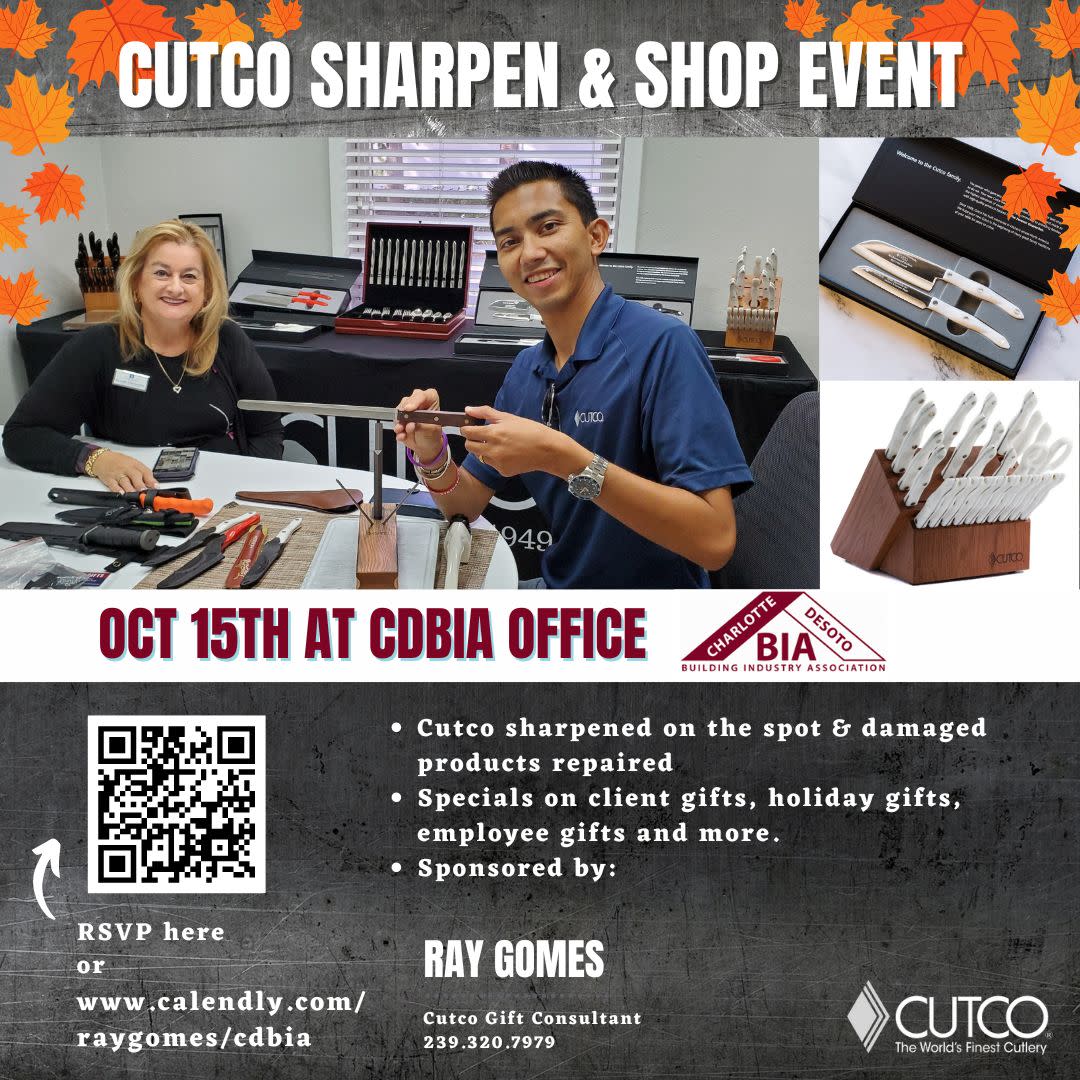 Click here to register: www.calendly.com/raygomes/cdbia Local Cutco Cutlery professional and new CDBIA member Ray Gomes is coming to the office for a complimentary Cutco sharpen & shop event! You can bring in your Cutco knives for sharpening on the spot. If your Cutco product is damaged, we will be doing return shipping to the factory for repairs. We will also have a Cutco display with new products for yourself and for gifts for your clients, employees, VIPs, and specials on Cutco for the fall. When: Tues Oct 15th all day by appointment Where: CDBIA office We just need to know you're coming! Please RSVP here: www.calendly.com/raygomes/cdbia If you have any questions, please reach out to us at 239.320.7979 or cara@360businessgrowth.com