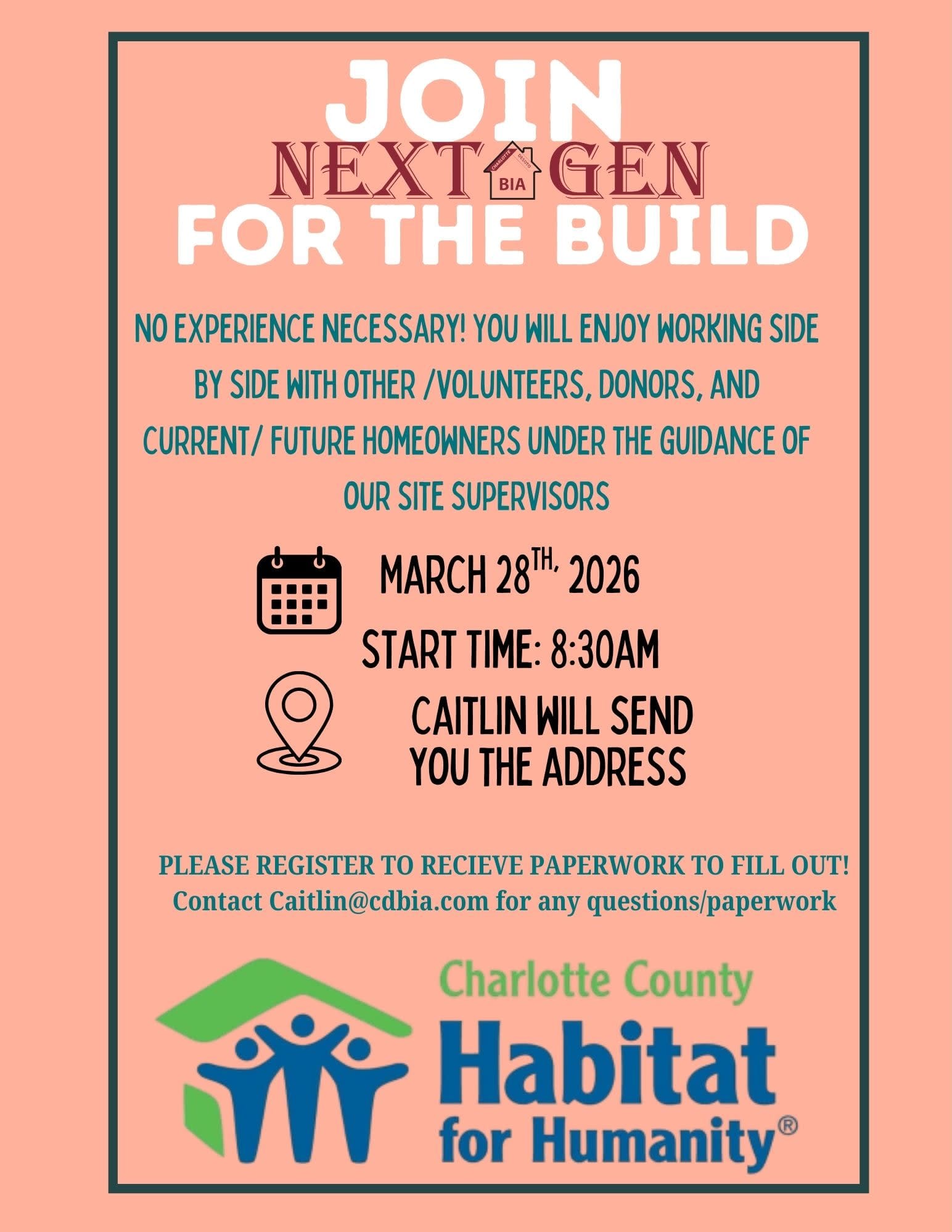 Join NextGen as we partner with Habitat for Humanity to help build a future for a local family. No construction experience is needed — just a willingness to help, learn, and be part of something meaningful. Working side by side with volunteers, donors, and future homeowners is an incredible reminder that a home is built not only with materials, but with compassion, teamwork, and heart. Spend the morning making a real impact in our community and helping turn the dream of homeownership into a reality. We would love to have you there! After you register, you will receive a email from Caitlin with a address and volunteer information! Thank you for all your help!