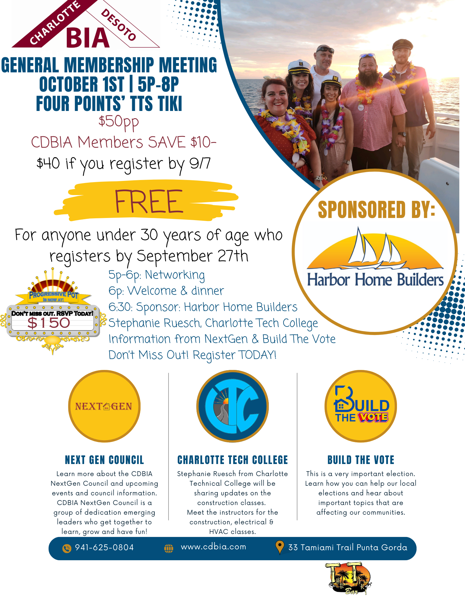 CDBIA October General Membership Meeting will be jam-packed with fun! The meeting is sponsored by Harbor Home Builders The price is $50.00 per person.**  **CDBIA Members: Register by September 27th and ticket price is only $40! FREE TICKET- We welcome you to bring your employees or friends. Anyone under the age of 30 is welcome to attend for free if they register by 9/27 Active Spikes: If you wear your spike pin you will get 2 drink tickets. Dinner will be an Italian buffet. The evening will consist of: Make sure you are logged in to get your savings! **Please note: If you register, and are not able to attend please email katelyn@cdbia.com by 12pm on Monday, September 30th, if you want a refund for October's GMM.  Thank you.
