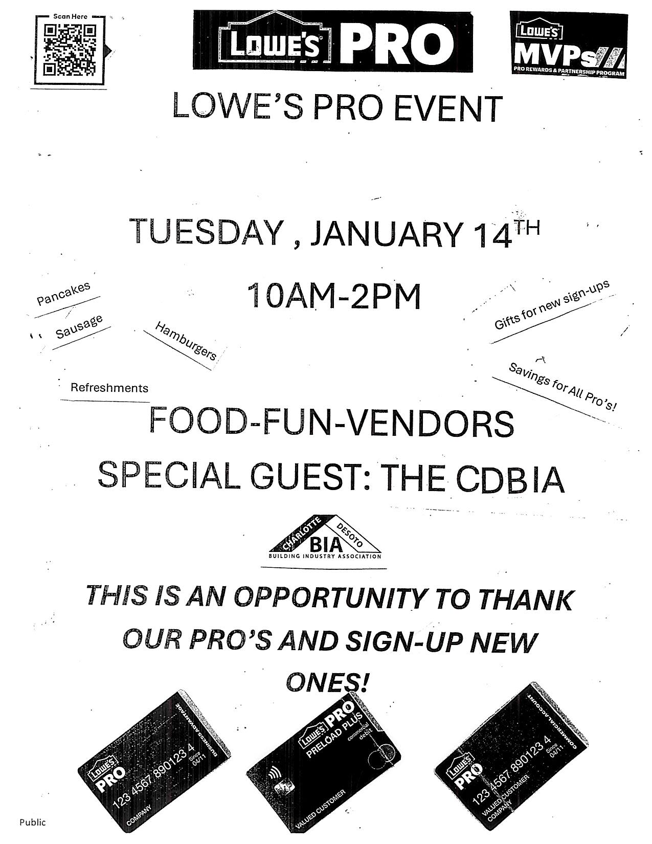 Save the date! The CDBIA will be at Lowe's in Port Charlotte from 10 am-2 pm on January 14th. Lowe's is hosting a Lowe's for Pros event. Free breakfast and lunch! There will be vendors and gifts for all new Lowes for Pros sign-ups! If you are not a member of the Lowe's for Pros, this free program offers additional savings. AND as a member of the CDBIA you save an additional 2% which will show as a credit on your bill monthly! After you register for your Lowes for Pros, click on this link to start enjoying the additional savings Lowe’s Pro Savings Program | NAHB