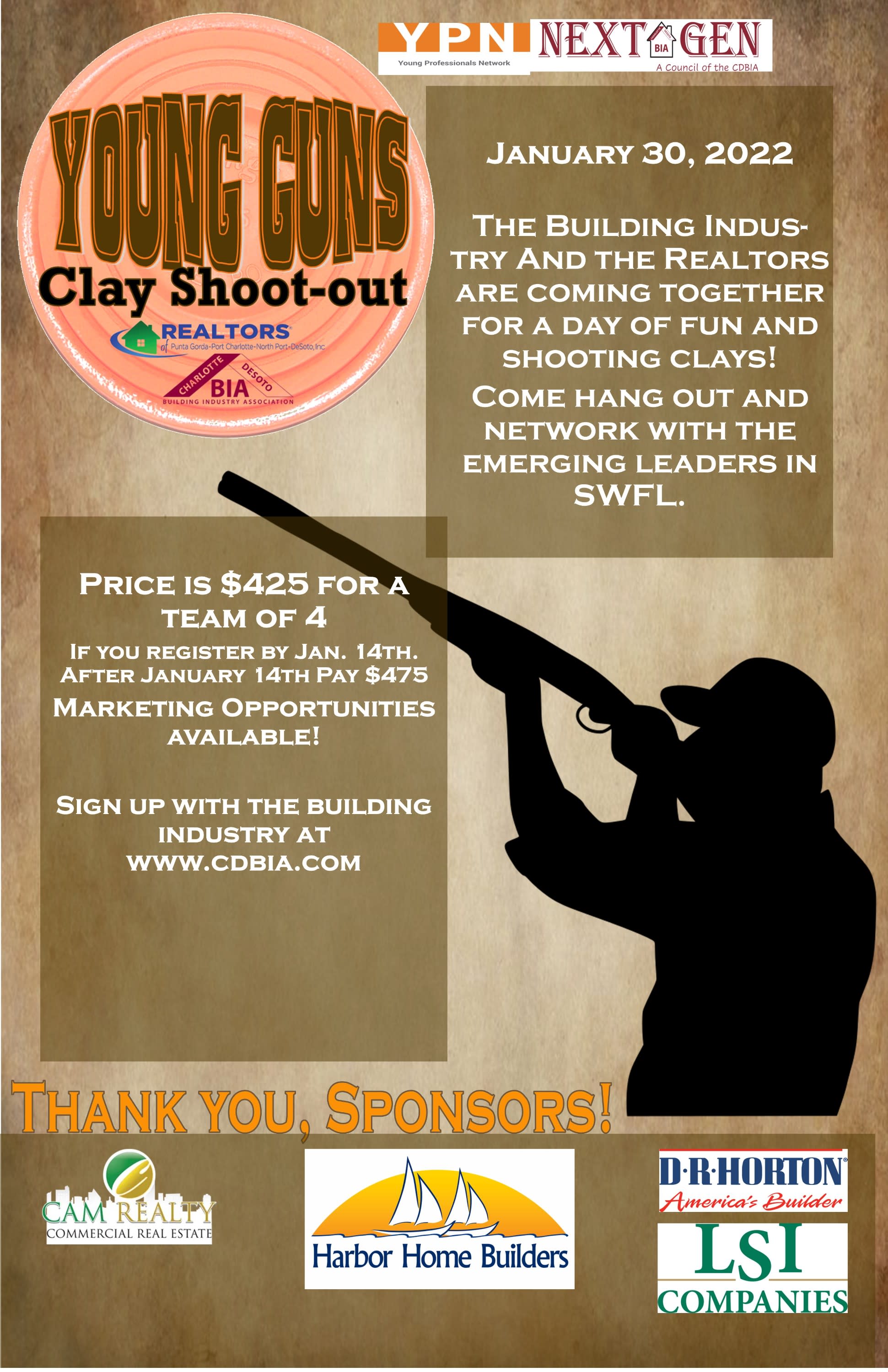 The Charlotte-DeSoto Building Industry Association and The REALTORS® of Punta Gorda-Port Charlotte-North Port-DeSoto, Inc.® YPN invites you to join us in our Young Guns Shoot Out to be held on Sunday, January 30th, 2022 at Sarasota Trap & Skeet Gun Club in Nokomis, Florida. Registration is at 8 AM, and the fun starts at 9 AM.